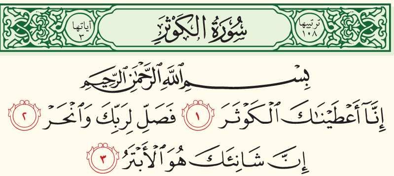 قال الإِمام القرطبى ما ملخصه : واختلف أهل التأويل فى الكوثر الذى أعطيه النبى صلى الله عليه وسلم على ستة عشر قولاً : الأول : أنه نهر فى الجنة ، رواه البخارى عن أنس ، ورواه الترمذى - أيضاً - عن ابن عمر . . الثانى : أنه حوض للنبى صلى الله عليه وسلم فى الموقف . . الثالث : أنه النبوة والكتاب . . الرابع : أنه القرآن . . الخامس : الإِسلام .