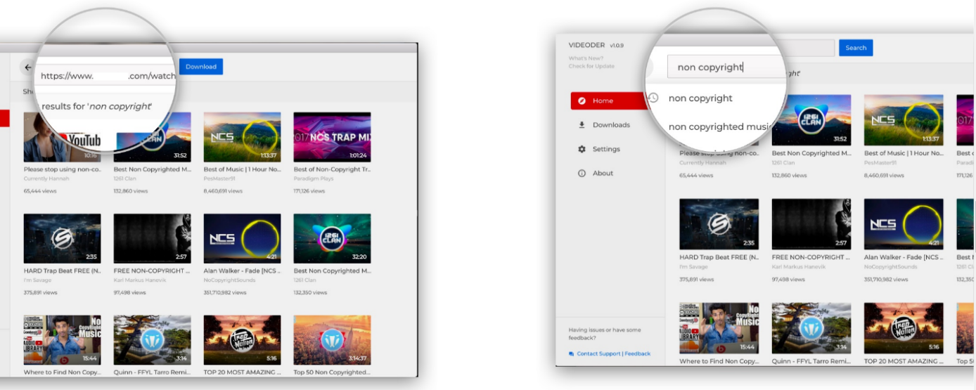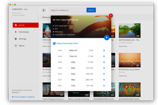 صار برنامج Videoder يدعم واجهة مستخدم احترافية و سهلة التعامل حتى أنها من الاستعمال الأول ستتأقلم معها, بحيث ستجد بالقائمة الجانبية للخيارات خيار Home , Downloads, Settings و About و هذه الخيارات لا تحتاج تفصيل كونها واضحة. و بالوسط نجد نافدة العرض, هذا كل ما تضمه واجهة المستخدم.