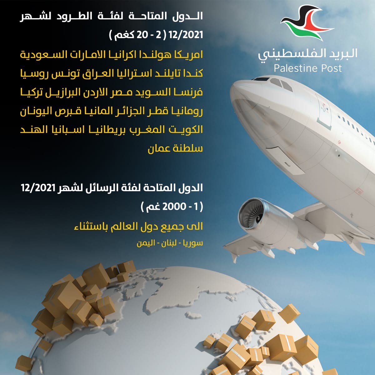 ويتيح البريد الفلسطيني ارسال بعائث بريدية صغيرة أقل من "2 كيلوغرام" لجميع دول العالم باستثناء مناطق النزاع.