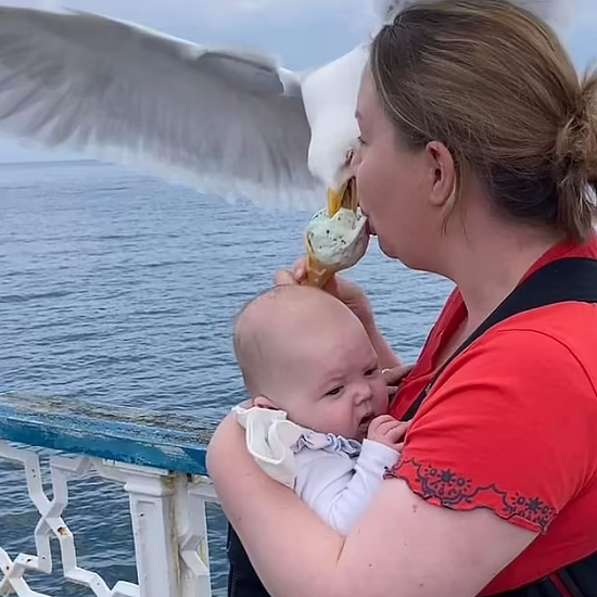 عندما تجلس بأحد الأماكن العامة وتتناول بعض الأطعمة سواء كانت قطعة شيكولاتة أو خبز محشو بلحم الدجاج وغيرها من أنواع الحشو، قد تجد بعض القطط والكلاب ملتفة حولك ينتظرون أن تعطيهم قطعة من الطعام الذى تتناوله، لكن لا يخطر ببالك أن يسقط عليك طائر النورس ليتناول قطعة من الأيس كريم الذى تتناوله، لكن هذا ما حدث مع سيدة ببريطانيا.