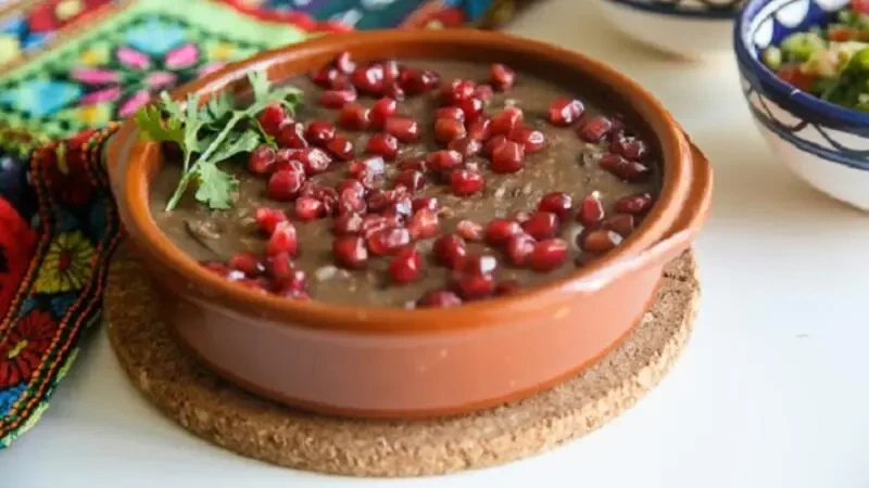 وأخيراً، بعد سكب الخليط في الطبق زينيه بالثوم المقلي الذي قمنا برفعه سابقًا وبحبات من الرمان، وصحتين وعافية.