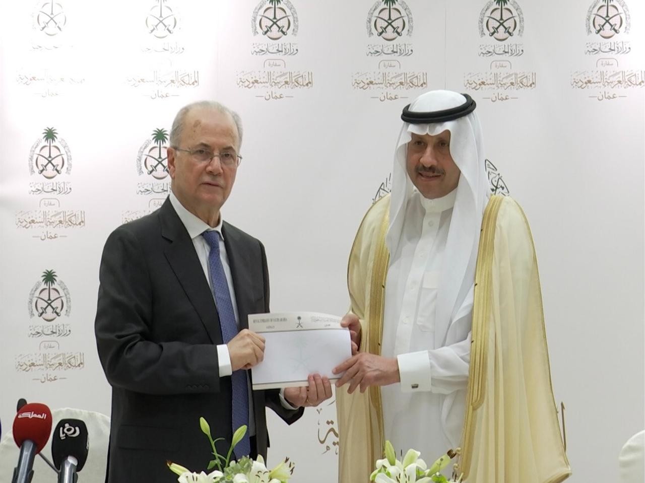 جاء ذلك خلال لقاء رئيس الوزراء محمد مصطفى مع سفير المملكة العربية السعودية لدى الأردن، سفير المملكة العربية السعودية غير المقيم لدى دولة فلسطين، القنصل العام في القدس نايف بن بندر السديري، في مقر السفارة السعودية بالعاصمة الأردنية عمان، والتي أعلن فيها عن تسليم دولة فلسطين الدفعة الشهرية الأولى وقيمتها عشرة ملايين دولار.