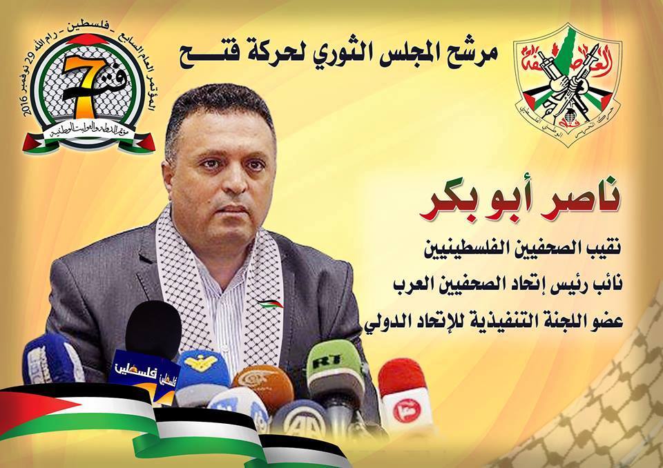 أعلن نقيب الصحفيين الفلسطينيين ونائب رئيس اتحاد الصحفيين العرب وعضو اللجنة التنفيذية في الاتحاد الدولي للصحفيين وممثل فلسطين في الاتحاد الأوروبي للصحفيين ناصر أبو بكر، اليوم الاثنين، عن نيته للترشح للمجلس الثوري لحركة "فتح" في مؤتمرها العام السابع المنعقد في رام الله.