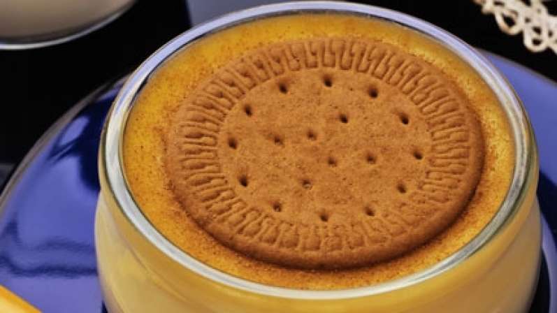 4- للتزيين: رشّي بعض الكاكاو على كلّ كاسة كستارد ثمّ ضعي قطعة بسكويت.