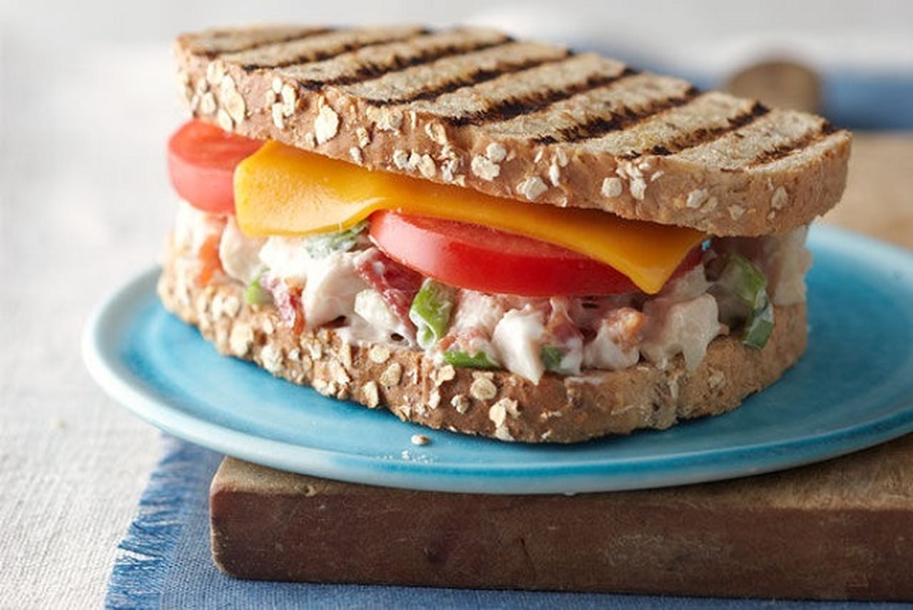 يوضع الخس الشرائح  والطماطم على الدجاج المتبل في الساندويتشات ويقدم بالهنا والشفا.