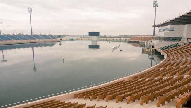 حولت الأمطار الغزيرة، التي هطلت أمس الجمعة، على المنطقة الشرقية بالسعودية ملعب الأمير سعود بن جلوي بالراكة بمدينة الخبر، إلى بركة من المياه، أشبه بحمام سباحة كبير.